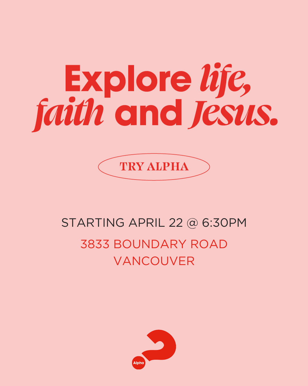 Our next Alpha launches Wed, Apr 22 and runs for 9 weeks. Each evening will start with dinner, followed by a short film, and relaxed conversation.
